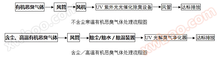 Selepas memasukkan peralatan pengeluaran gas buang organik ke peralatan deodorisasi fotokatalisis, penggunaan sinar UV UV bertenaga tinggi dan ozon untuk gas bau buruk untuk tindak balas oksidasi pemecahan sinergi, supaya bahan-bahan gas bau buruk dipecahkan menjadi sebatian molekul rendah, air dan karbon dioksida, kemudian dikeluarkan melalui paip pengeluaran.